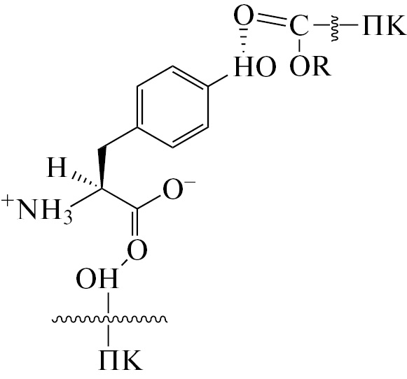 Выявлены следующие особенности влияния строения Tyr на взаимодействие с ПК. Во-первых, присутствие гидроксильной группы в Tyr является благоприятным для связывания с ПК и определяется ее участием в образовании Н-связей с карбонильной функцией ПК, что отражается на большей устойчивости ПК-Tyr по сравнению с ПК-Phe (табл. 2). Во-вторых, можно предположить, что, в отличие от Tyr, фенилаланин не связывает макромолекулы между собой [20], а взаимодействует с каждым звеном в полимерной цепочке, приводя к структуре вида:
