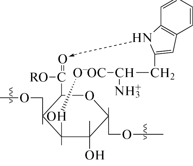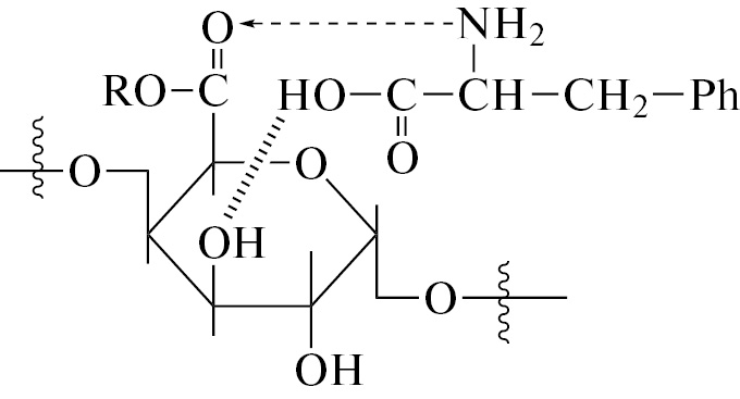 При смешении ПК с Tyr в спектре 13С ЯМР наибольший сдвиг на 5.77 м.д. в сторону слабого поля наблюдается для сигнала атома углерода С(1) ароматического кольца, непосредственно связанного с гидроксильной группой. Также можно отметить значительный сдвиг сигнала углерода карбоксильной группы С11 на 0.55 м.д. (табл. 1). В ИК-спектре комплекса ПК-Tyr интенсивность ПП n(С=О) ПК и ПП n(С=О в СОО–) Tyr резко уменьшается и сдвигается в область больших и меньших длин волн соответственно на 4 и 9 см–1. Также происходит низкочастотный сдвиг ПП n(–ОН) в области 3600–3000 см–1 и высокочастотный сдвиг ПП n(С–О) и n(С–С) пиранозного кольца на 4–8 см–1. Очевидно, формирование комплексов ПК-Tyr протекает через координацию одной молекулы аминокислоты и одного углеводного звена полисахарида с образованием между ними межмолекулярных связей с участием кислородсодержащих функциональных групп основной цепи ПК и карбоксильной и гидроксильной групп Tyr с образованием следующей структуры: