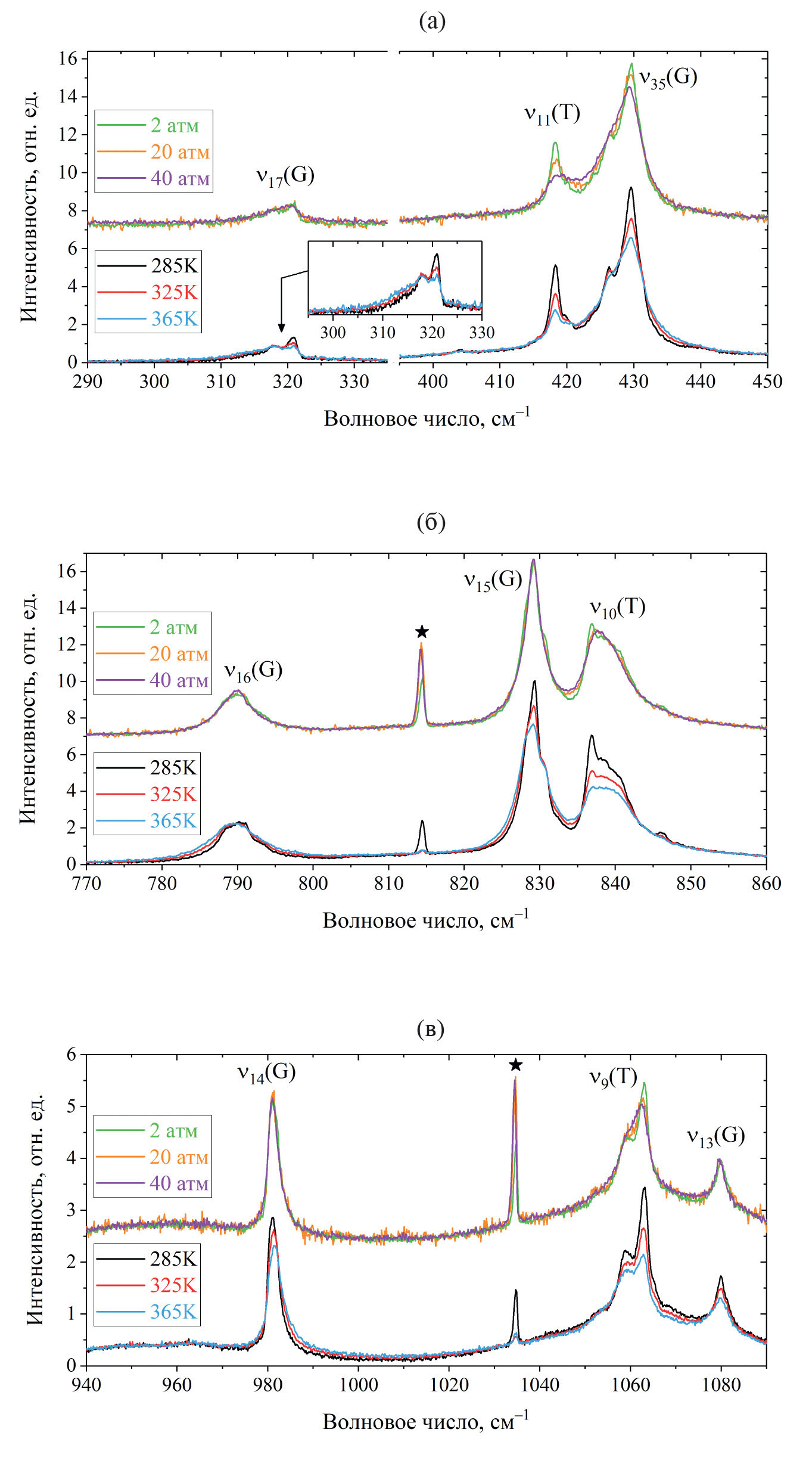 Рис. 2. Влияние температуры и давления на колебательные полосы КР н-бутана в области 290–450 см–1 (а), 770–860 см–1 (б) и 940–1090 см–1 (в). Нижние спектры соответствуют чистому н-бутану при температурах 285, 325 и 365 К (давление 2 атм). Сверху приведены спектры чистого н-бутана при давлении 2 атм и смеси н-бутан/метан (4/96%) при давлении 20 и 40 атм (температура 300 К), где полосы метана были вычтены. Все спектры нормированы по интегральной интенсивности. Полосы транс- и гош-конформеров обозначены символами (T) и (G) соответственно. Положения линий водорода обозначены звездочками