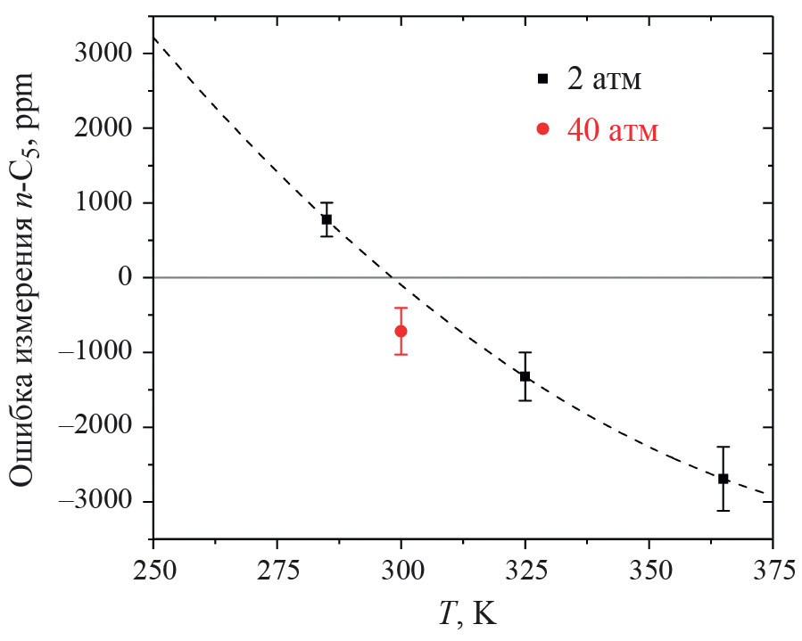 где C – концентрация н-бутана в природном газе, A – интегральная интенсивность в спектре н-бутана, вычисленная в области характеристического пика н-пентана 822.5–855.9 см–1 [42], B – интегральная интенсивность характеристического пика н-пентана в чистом газе, T и P –давление и температура среды, T0 = 300 К, P0 = 2 атм. Расчеты были выполнены для 4% н-бутана в природном газе. Как показано на рис. 5, вариация температуры анализируемой пробы газа в широком диапазоне 270–370 К приводит к абсолютной ошибке измерения н-пентана порядка 0.1%, в случае использования референсного спектра н-бутана, полученного при комнатной температуре. Отклонение температуры газа в пределах ±5 К приведет к ошибке 290 ppm. С ростом давления природного газа ошибка измерения также возрастает и достигает 700 ppm при 40 атм. Отметим, что требуемый диапазон изменения концентрации н-пентана в природном газе составляет от 10 ppm до 2% [7]. Таким образом для измерения н-пентана с точностью 10 ppm, флуктуации температуры и давления пробы не должны превышать ±0.2 К и ±0.6 атм.