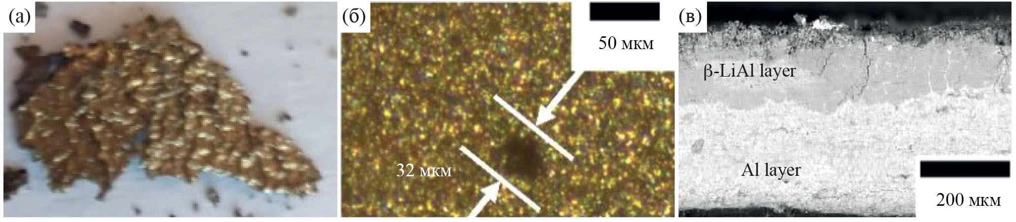 Рис. 2. Сопоставление внешнего вида наслоений верхнего слоя из настоящей работы (а) с микрофотографиями двух интерметаллидов: AlLi5 (б) и срез слоя β-AlLi над Al (в), полученных в работе [12]