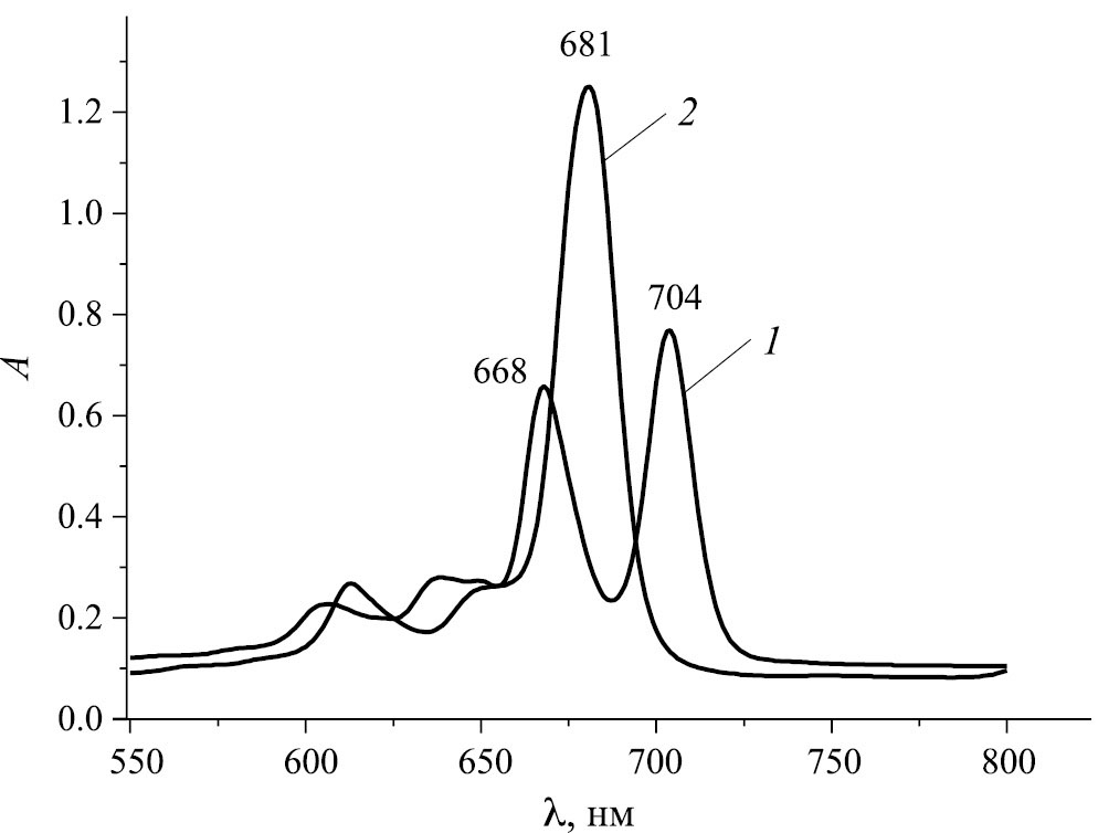 Спектральные исследования показали, что в среде инертного бензола электронный спектр поглощения (ЭСП) H2PcCl4(OPh-Me-i-Pr)4 имеет в видимой области две расщепленные Qх- и Qy-составляющие Q-полосы с λI = 704 и λII = 668 нм соответственно, что указывает на D2h-симметрию молекулы (рис. 1). В среде протоноакцепторного н-бутиламина (пиперидина) расщепление Q-полосы исчезает, а симметрия молекулы повышается от D2h до D4h (рис. 1). Следовательно, H2PcCl4(OPh-Me-i-Pr)4 в присутствии BuNH2 (Pip) проявляет свойства двухосновной NH-кислоты, а образующиеся при этом комплексы с переносом протонов не подвергаются деструкции с течением времени. На это указывает характер ЭСП H2PcCl4(OPh-Me-i-Pr)4 в н-бутиламине (пиперидине), который остается без изменений в течение ~ 67 ч при 333 К (рис. 1), в отличие от ЭСП комплексов образованных с участием β-замещенных порфиразинов [9].
