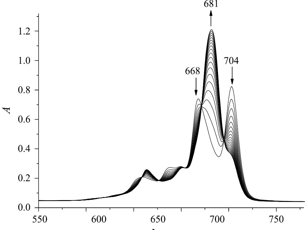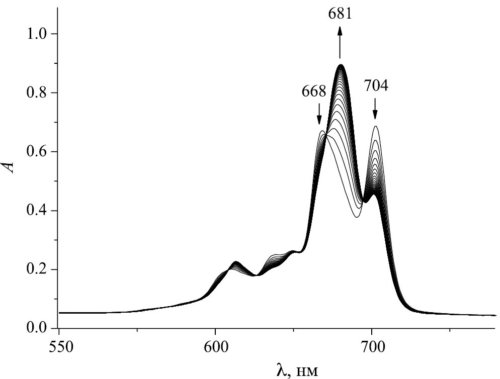 Кинетические исследования показали, что взаимодействие H2PcCl4(OPh-Me-i-Pr)4 с н-бутиламином и пиперидином наблюдается в интервале концентраций СоBuNH2 = СоPip= 0.5–5.06 моль/л в бензоле. При этом не зависимо от природы основания спектрально регистрируется уменьшение интенсивности Qх- и Qy-составляющих Q-полосы с λI и λII соответственно и одновременный рост интенсивности полосы поглощения с λ = 681 нм (рис. 2, 3). Реакция