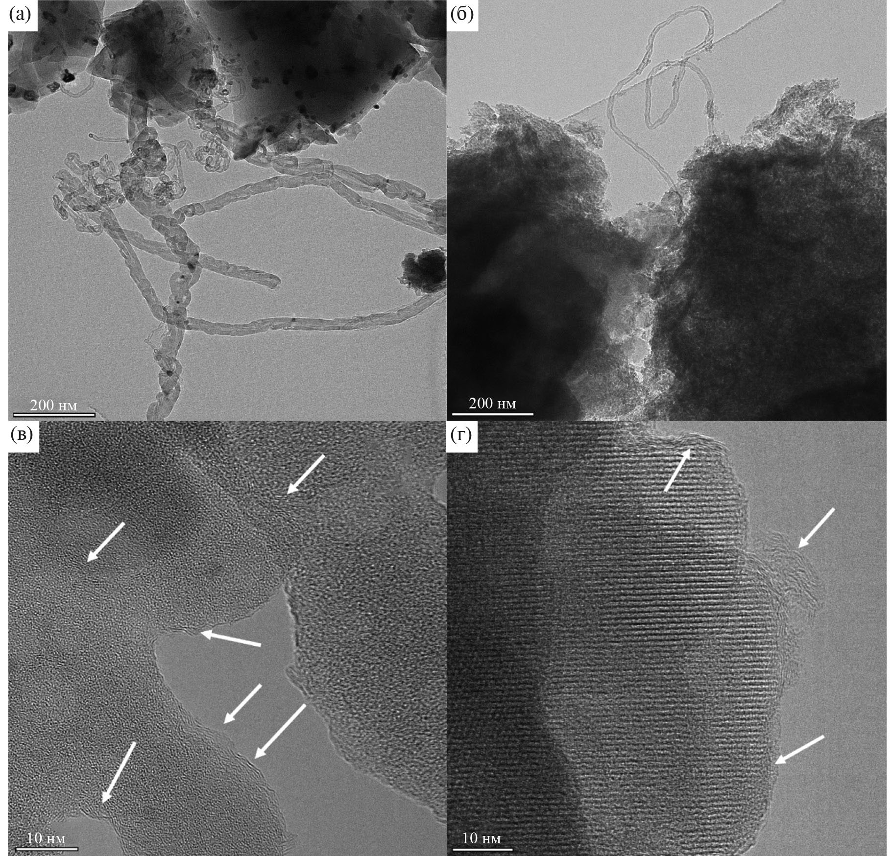 Как видно из изображений ПЭМВР, для катализатора HZSM-5 после участия в процессе превращения прямогонной бензиновой фракции нефти характерно формирование углеродных нановолокон с толщиной от 5 до 50 нм, длина волокон может достигать нескольких микрон (рис. 3а). Видно, что на самих волокнах присутствуют небольшие частицы катализатора в виде темных округлых частиц с размерами 3–30 нм. Для катализатора FeSiO3/НZSM-5 (рис. 3б) также характерно формирование нановолокон, но количество данных структур меньше, чем для исходного образца HZSM-5. При этом необходимо отметить, что на катализаторе FeSiO3/НZSM-5 происходит дополнительное формирование на поверхности цеолита слоя аморфизированного углерода. Для катализаторов FeC/НZSM-5 (рис. 3в) и сферозола/НZSM-5 (рис. 3г) характерно образование слоя графитоподобного углерода на поверхности цеолита (показано стрелками). Толщина покрытия составляет от 1 до 5 слоев углерода для катализатора FeC/НZSM-5, а в случае образца сферозола/НZSM-5 формируются еще глобулярные структуры с размерами до 10 нм.