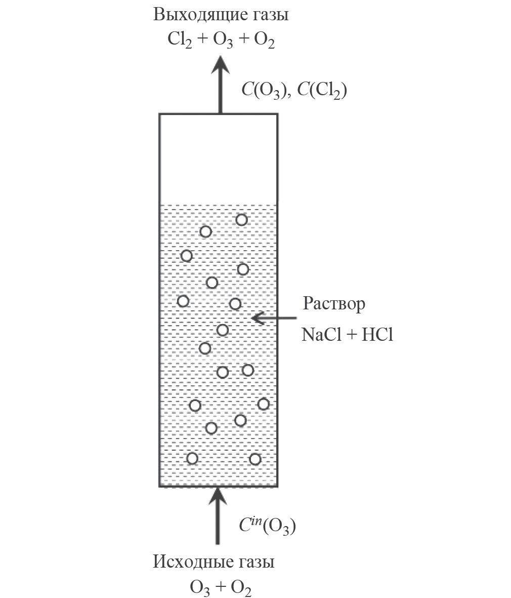 Концентрацию молекулярного хлора, C(Cl2), моль/л, в выходящих из реактора газах определяли после термического разложения остаточного озона, методами либо фотометрической иодометрии [13, 14], либо прямой спектрофотометрии Cl2 [15]. Из этих данных рассчитывали значения скорости выделения хлора, отнесенной к объему реакционного раствора (rCl2, моль л–1с–1), в стационарном режиме функционирования реактора: