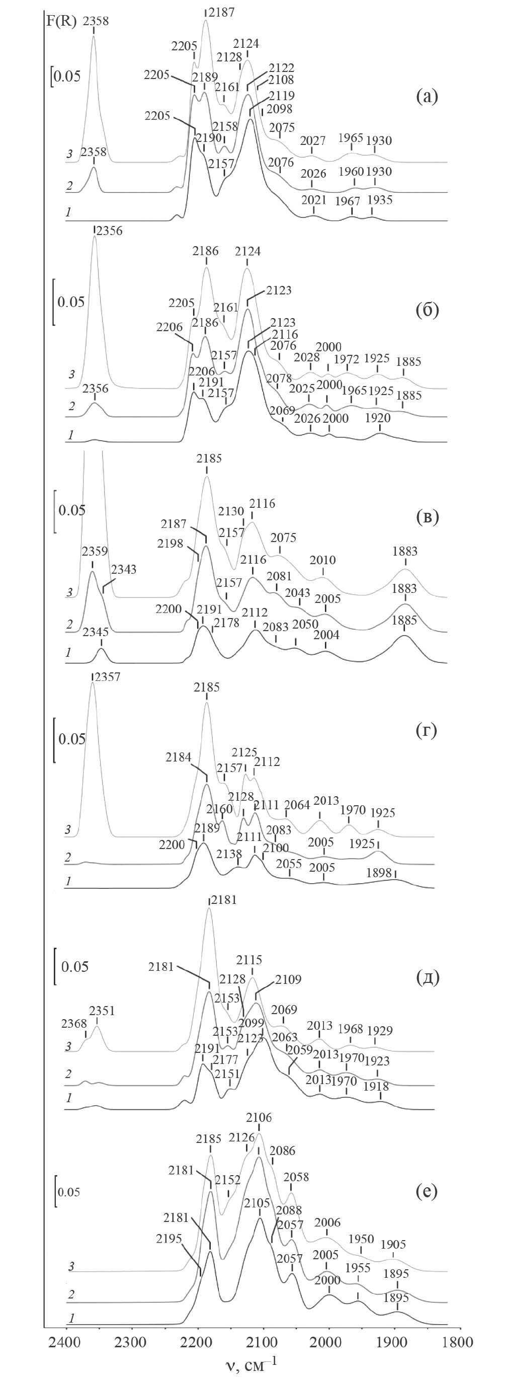 Рис. 4. Разностные ИК-спектры СО, адсорбированного при комнатной температуре на катализаторах: Fe/S (а), 0.15Sm/Fe/S (б), Fe/0.15Sm/S (в), (Fe+0.15Sm)/S (г), (Fe+1.5Sm)/S (д), 0.15Sm/(Fe+0.15Sm)/S (е). Давление СО: 5 (1), 20 (2), 50 Торр (3).