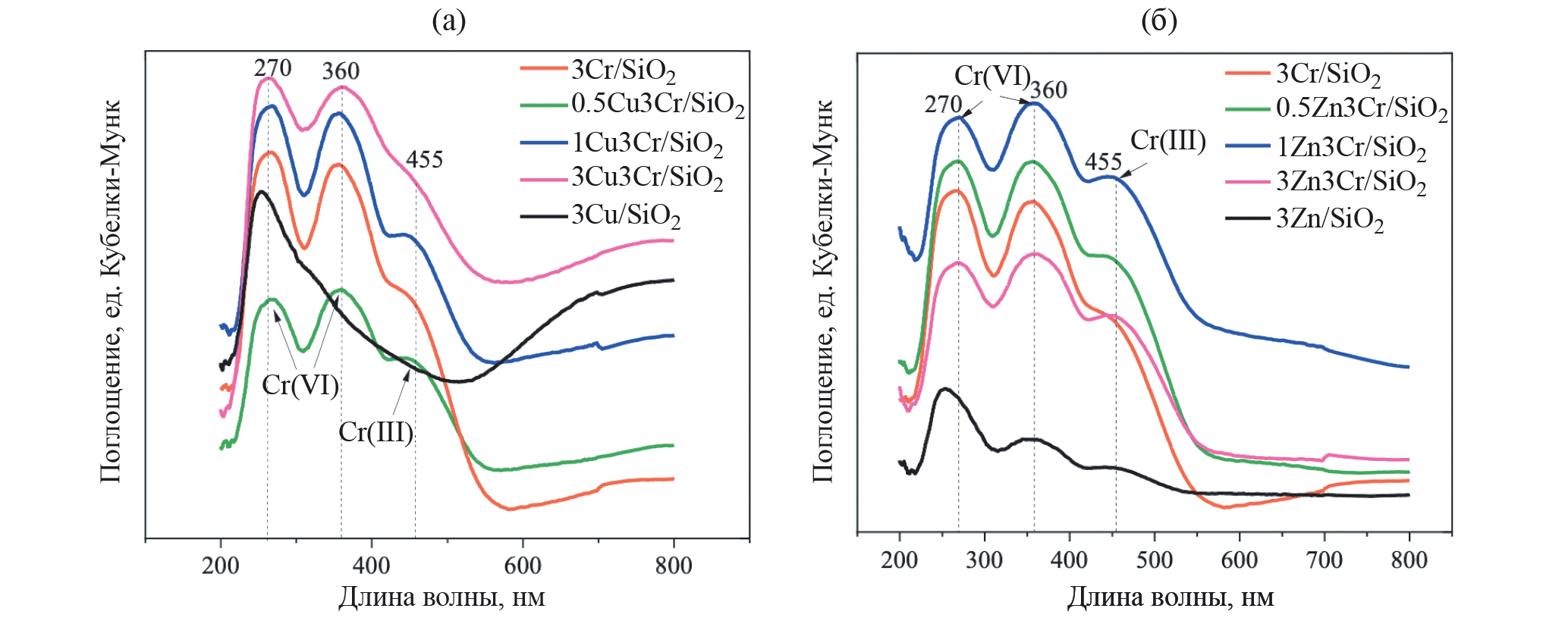 На рис. 3 представлены УФ-ВИД-спектры монометаллоксидных 3М/SiO2 (M = Cr, Сu, Zn) и биметаллоксидных катализаторов 3Cr (0.5, 1, 3) М/SiO2 (M = Сu, Zn), полученные до проведения каталитических испытаний. На рис. 3 для сравнения представлен спектр катализатора 3Cr/SiO2, который демонстрирует две интенсивные полосы поглощения при 260 и 360 нм и более слабую полосу при 455 нм. Полосы при 260 и 360 нм соответствуют Cr(VI) в тетраэдрической координации, а полоса около 455 нм соответствует октаэдрической координации Cr(III) в кластерах Cr2O3 или CrOx [41, 42]. В спектрах отсутствует полоса при 600 нм, также относящаяся к октаэдрической координации Cr(III). Это свидетельствует о том, что хром в образце 3Cr/SiO2 находится, в основном, в тетраэдрической координации Cr(VI).