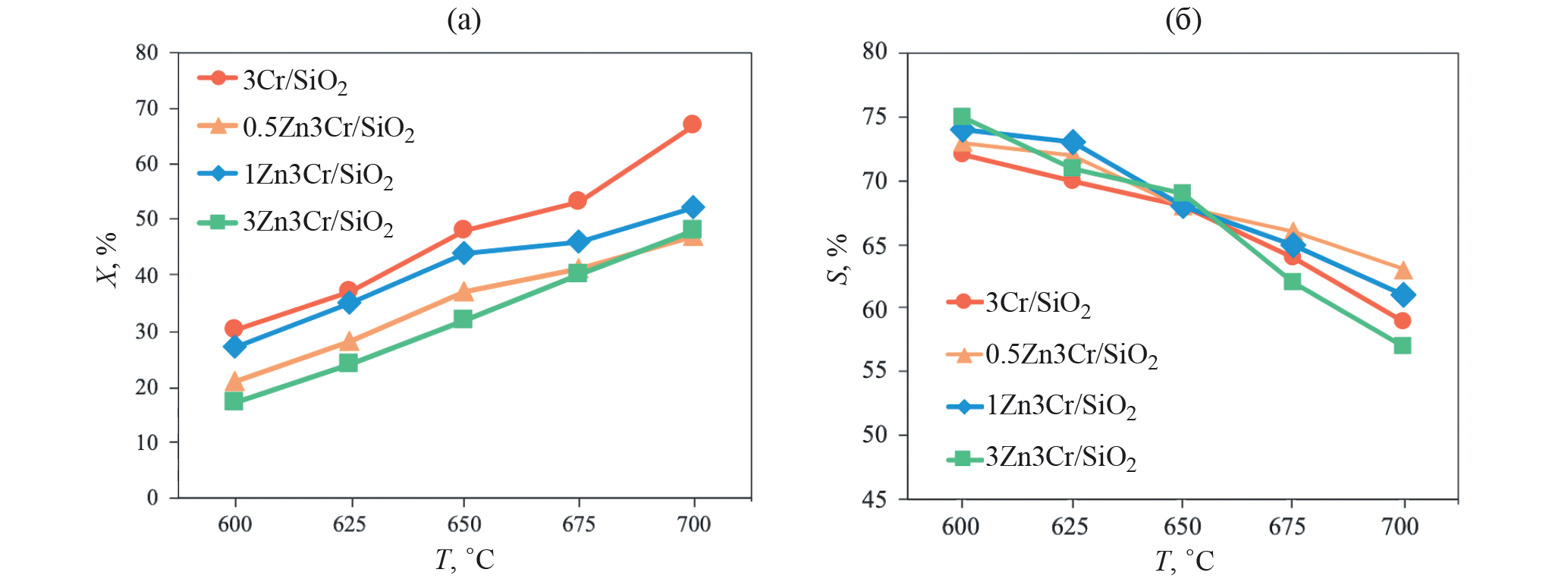 Каталитические системы синтезировали методом пропитки по влагоемкости из водных растворов нитратов хрома, цинка и меди. Более подробная методика приготовления катализаторов описана в работе [38]. Предварительно высушенный SiO2 марки Acros пропитывали водными растворами Cr(NO3)3⋅9H2O, Cu(NO3)2⋅3H2O и Zn(NO3)2⋅6H2O необходимой концентрации. Биметаллоксидные катализаторы были приготовлены методом совместной пропитки по влагоемкости. Монометаллоксидные катализаторы содержали 3, 5, 7 мас. % хрома, цинка или меди, а биметаллоксидные катализаторы 3 мас. % хрома и 0.5, 1, 3 мас. % второго металла, меди или цинка.