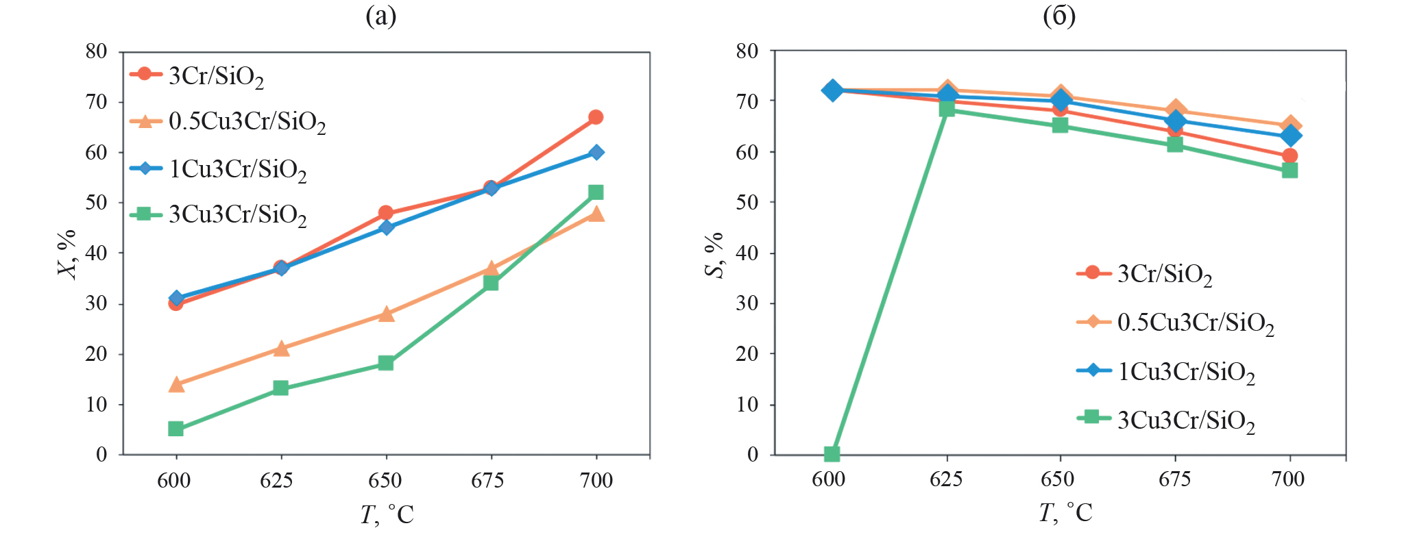 На первом этапе каталитических испытаний была исследована серия монометаллических катализаторов с содержанием активного компонента 0.5, 1, 3 мас. %. Результаты каталитических испытаний представлены в табл. 2 и на рис. 4, 5. Видно, что каталитическая система 3Сr/SiO2 дает наилучшие каталитические характеристики, с самой высокой конверсией 48% и самой высокой селективностью по пропилену 68%.