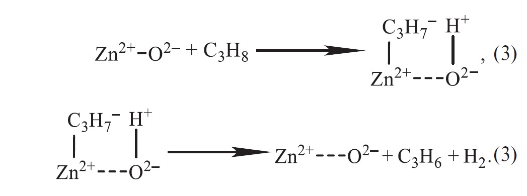 Тогда как, дегидрирование пропана на катализаторах на основе оксида цинка протекает по бифункциональному механизму: пропан диссоциативно адсорбируется на оксиде цинка, с последующим разложением полученного продукта путем одностадийного отщепления С3Н6 и Н2: