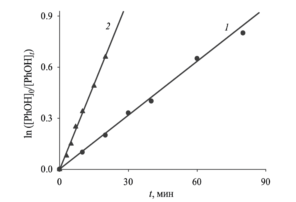 2. Fig. 1. Semi-logarithmic anamorphoses of the kinetic curves of phenol consumption in the reaction with hydrogen peroxide at 333 K (1) and 353 K (2); [PhOH]0 = 4 × 10–5 mol/l, [H2O2]0 = 1 × 10–2 mol/l.