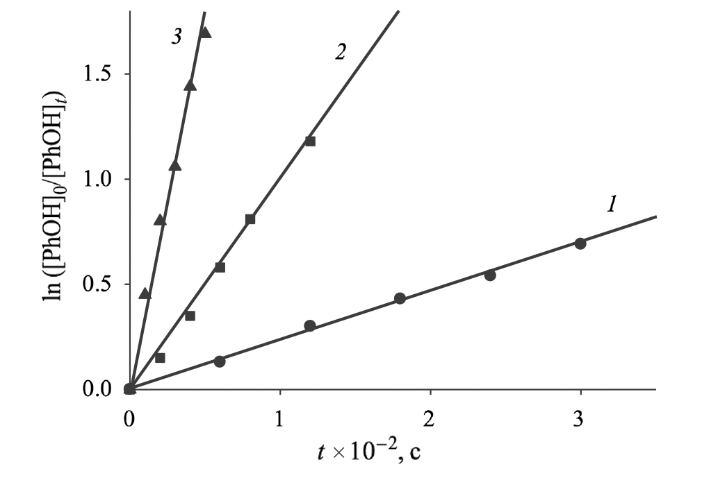 Реакцию фенола с пероксидом водорода в водных растворах проводили в стеклянном термостатируемом реакторе (температуру в реакторе поддерживали с помощью термостата LOIP LT-105a). Кинетику процесса изучали методом отбора проб, определяя остаточные концентрации PhOH через определенные промежутки времени. Начальная концентрация фенола в реакционной смеси составляла 4 × 10–5 моль/л, концентрацию пероксида водорода варьировали в пределах (1.0–5.0) × × 10–2 моль/л. При этом во всех опытах поддерживался избыток пероксида водорода по отношению к фенолу.