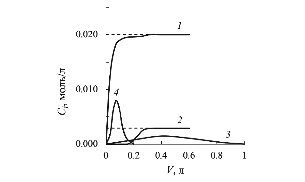 На рис. 1 приведены выходные кривые, описывающие изменение концентрации никотиновой кислоты и железа (III) в фильтрате при их сорбции на 1 мл катионита Dowex 50 из водного раствора при pH 1.69 или в элюате при последующей десорбции. Количество кислоты и железа, сорбированное слоем ионита, соответствует площади, ограниченной штриховой линией, показывающей концентрацию компонента в исходном растворе (0.02 моль/л никотиновой кислоты и 0.0029 моль/л FeCl3), кривыми 1 для кислоты и 2 для железа, а также осью ординат. Количество десорбированных кислоты или железа из той же ионообменной колонки соответствует площади под кривой 3 или 4. Данные по сорбции и десорбции компонентов в пределах ошибки совпадают. Погрешность экспериментально измеренных концентраций оценивалась с доверительной вероятностью 0.95.