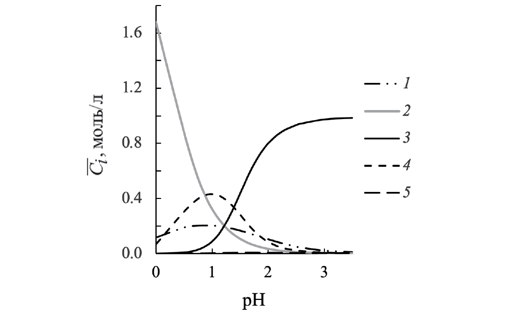 Рис. 2. Зависимости концентрации индивидуальных компонентов (Ci) от рН водных растворов, содержащих 0.02 моль/л никотиновой кислоты и 0.0029 моль/л FeCl3: 1 – C[H2L], 2 – CH+, 3 – C[FeL], 4 – CFe3+, 5 – C[Fe(OH)]2+.