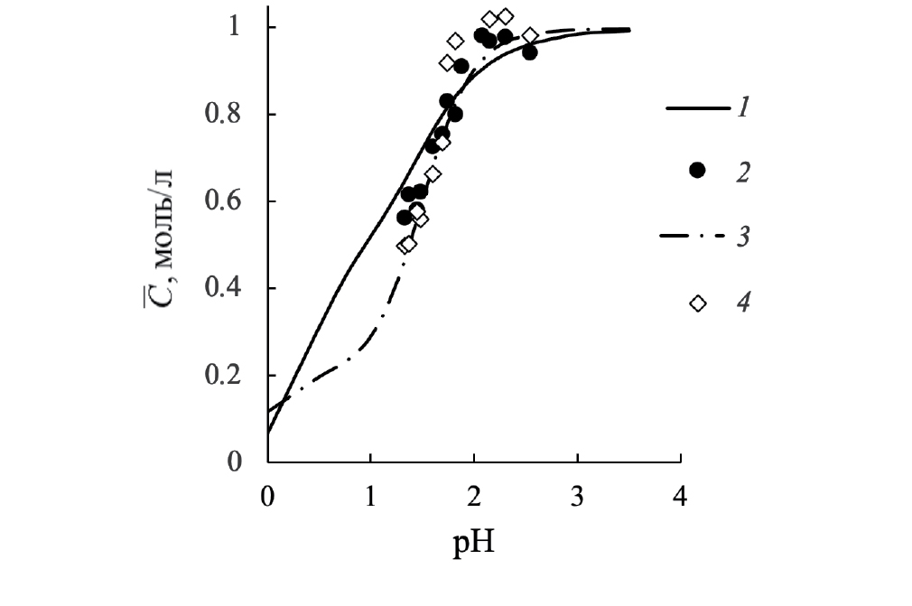 Рис. 5. Зависимости концентраций железа и никотиновой кислоты в сульфокатионите Dowex 50 от рН равновесного раствора. Линии – расчет, маркеры – эксперимент; CFe (1, 2), CNic (3, 4).