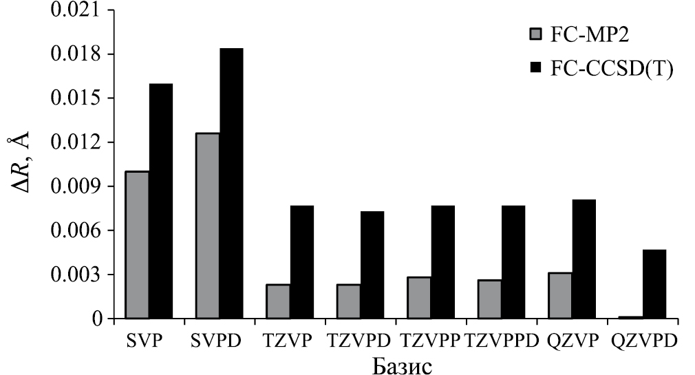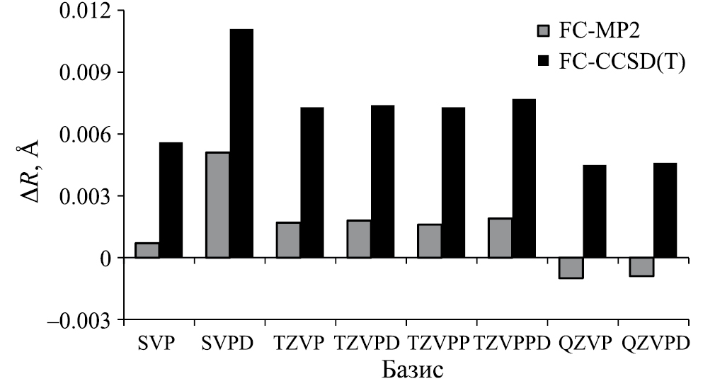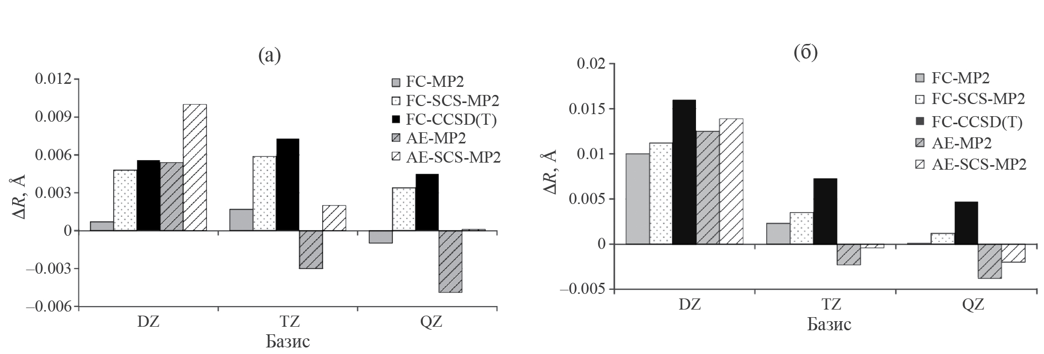 Ошибки длин связи в расчетах с использованием разных методов в различных базисах приведены на рис. 6. В первую очередь можно заметить, что для обоих объектов в любых базисах SCS-MP2 переоценивает длину связей по сравнению со стандартным MP2. При этом полученные с помощью FC-SCS-MP2 результаты действительно ближе к результатам FC–CCSD(T) по сравнению с результатами FC–MP2. Это свидетельствует в пользу применимости SCS-MP2.