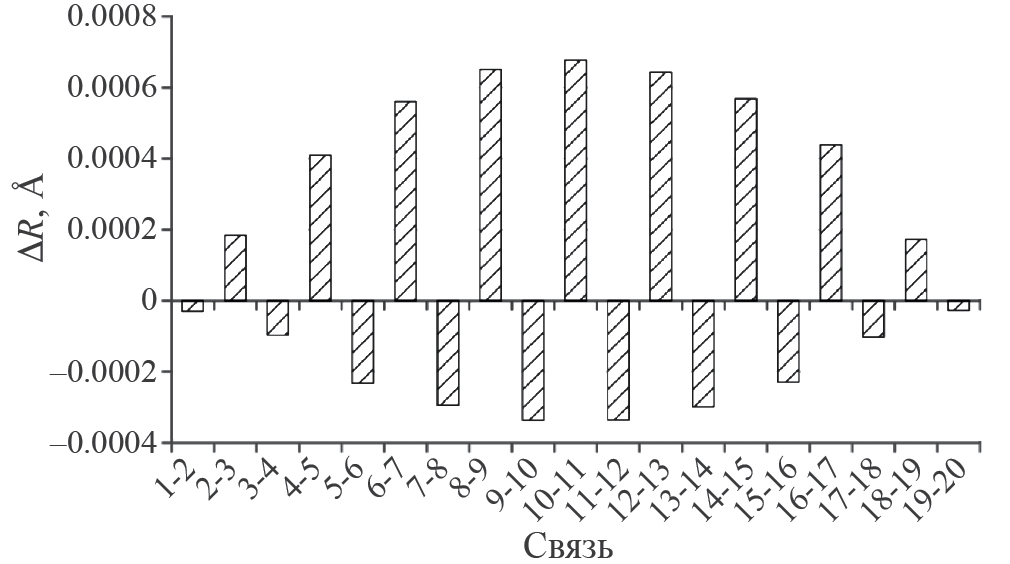 Для того, чтобы проверить действительно ли использование этих приближений не вносит значимой ошибки при описании полиенов, были проведены и сопоставлены результаты расчетов для 3-ена, 4-ена и 10-ена. Разности длин связей 10-ена, полученные с и без использования этих приближений, приведены на рис. 8. Аналогичные разности для 3-ена и 4-ена не превышают по модулю 0.0003 Å.