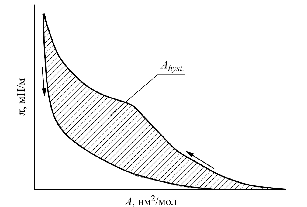 В ряде работ изучение гистерезиса использовалось для качественной оценки агрегации молекул и стабильности плавающих слоев [24, 36–39], однако количественная оценка этих процессов не проводилась. Только после того, как в работе [35] была представлена физическая интерпретация петли гистерезиса: площадь петли пропорциональна энергии, затраченной на создание данной надмолекулярной структуры, – стали возможны количественные оценки.