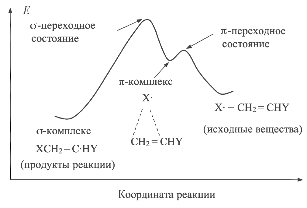 Результатом экспериментальных работ стало создание качественного механизма присоединения радикалов к алкенам на стадии зарождения цепи (рис. 1), согласно которому первоначально образуется π-комплекс, представляющий собой ассоциат радикала с двойной связью ненасыщенного соединения (первичный комплекс межмолекулярных столкновений) [6, 7]. Далее в ассоциате происходит взаимодействие атома радикала с каким-то определенным атомом углерода двойной связи, при этом образуется неустойчивое σ-переходное состояние с зарождением новой связи, которое трансформируется в конечный продукт радикального присоединения.