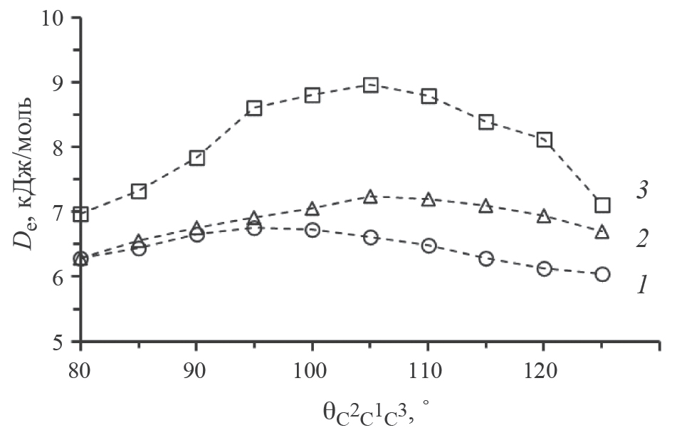 Во-вторых, для каждой кривой ППЭ методом UHF-DLPNO-CCSD(T) была определена энергия диссоциации, аналогично определенной в [34] для комплекса этилена и кислорода в основном состоянии, как De=E(5 Å)–E(Re), где E – значения полной энергии комплекса при RC1C3= 5 Å и Re – значении RC1C3 в комплексе с наименьшей полной энергией в сечении ППЭ. Величины Re в комплексах при различных значениях θ составили 3.6–4 Å.