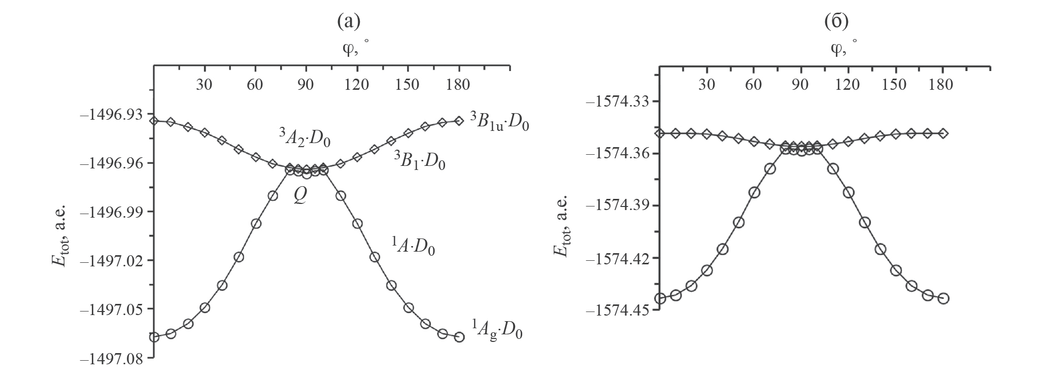 В “перпендикулярном” этилене (D2d) волновые функции синглетного 1B1 и триплетного 3A2 состояний антисимметричны относительно плоскости σ (Сs), поэтому в комплексе C2H4(D2d)-CCl3 симметрии Cs дублетное состояние имеет симметрию2Aʺ (1B1·D0), квартетное – 4Aʺ (3A2·D0). В комплексах столкновений C2H4(D2)-CCl3 (0°<ϕ<90°) общей симметрии С1 дублетные и квартетные состояния могут быть обозначены как 2A (1A·D0) и 4A (3B1·D0) соответственно.