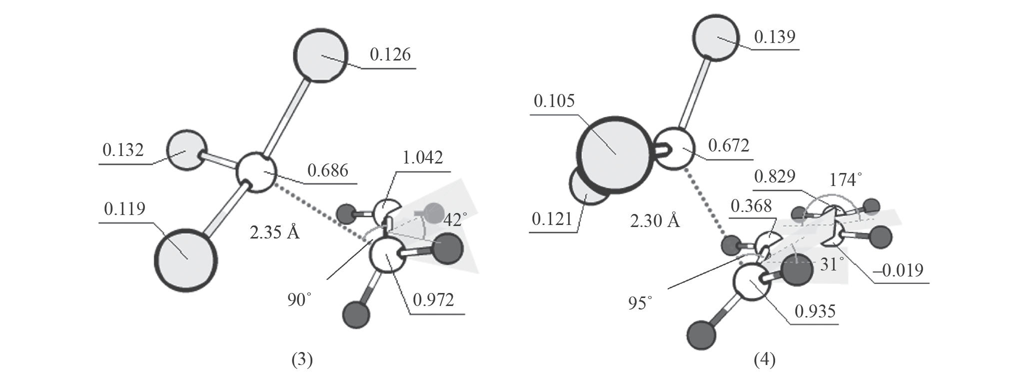 Рис. 5. Геометрические параметры и распределение спиновой плотности на атомах (а. е.) комплексов C2H4-CCl3 3 и s-транс-С4H6(C1)-CCl3 4 в электронных состояниях3B1·D0 и 3A·D0 соответственно. Атомы обозначены кружками, затемненные кружки – атомы хлора, темные – атомы водорода.