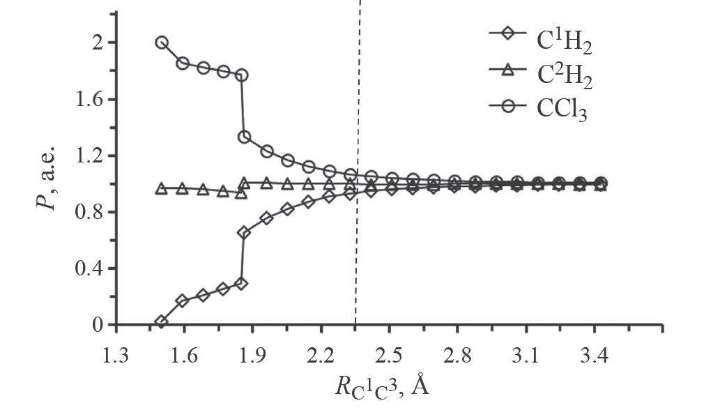 Согласно представленным на рис. 6 результатам, при изменении RC1C3 в интервале 3.48–2.35 Å распределение спиновой плотности трех неспаренных электронов комплекса C2H4-CCl3 3 соответствует рис. 5. Однако при RC1C3 < 2.35 Å отмечаются изменения в распределении спиновой плотности на структурных фрагментах (указано пунктиром на рис. 6). Существенные изменения происходят при RC1C3<1.86 Å: величина P(C2H2) остается равной 1 а. е., величина P(CCl3) увеличивается до 2 а. е.