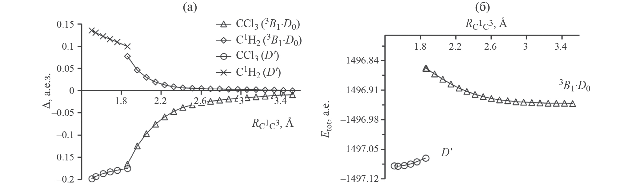 Величины Δ фрагментов комплексов определялись суммированием величин эффективных зарядов δi каждого i-го атома структурного фрагмента. Координата RC1C3 изменялась в интервале 1.86 Å <RC1C3<3.49 Å для квартетного состояния3B1·D0 комплекса C2H4-CCl3 3 и интервале 1.5 Å<RC1C3<1.86 Å для дублетного состояния Dʹ трихлорпропильного радикала.