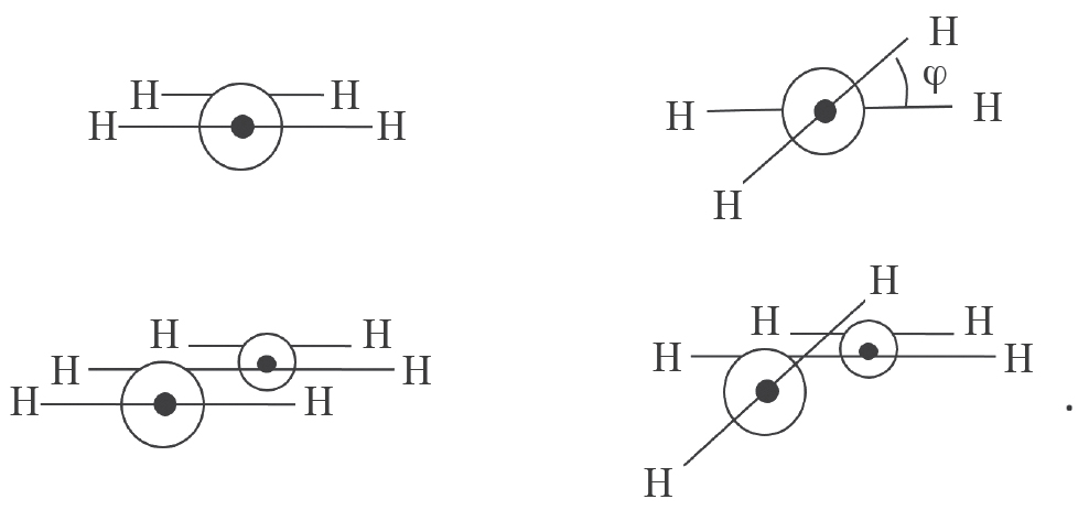 Согласно исследованиям Р. Малликена [14], вращение метиленовой группы относительно С‒С-связи приводит к пересечению основного синглетного 1Ag и низшего триплетного 3B1u электронных состояний. Частично “скрученный” этилен имеет симметрию D2 (1A и 3B1 – основное синглетное и низшее триплетное состояния, соответственно), который при дальнейшем повороте CH2-группы переходит в “перпендикулярный” этилен симметрии D2d (состояния 1B1 и 3A2 соответственно) c ортогональным расположением метиленовых групп друг относительно друга. Для этилена симметрии D2d (ϕ=90°) триплетное состояние 3A2 становится более стабильным, чем синглетное состояние 1B1. Ниже показан положительный поворот атомов водорода метиленовой группы против часовой стрелки на угол ϕ: