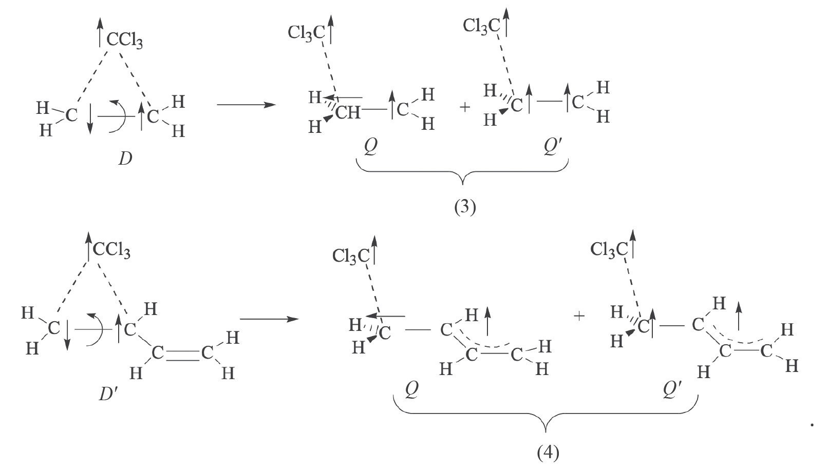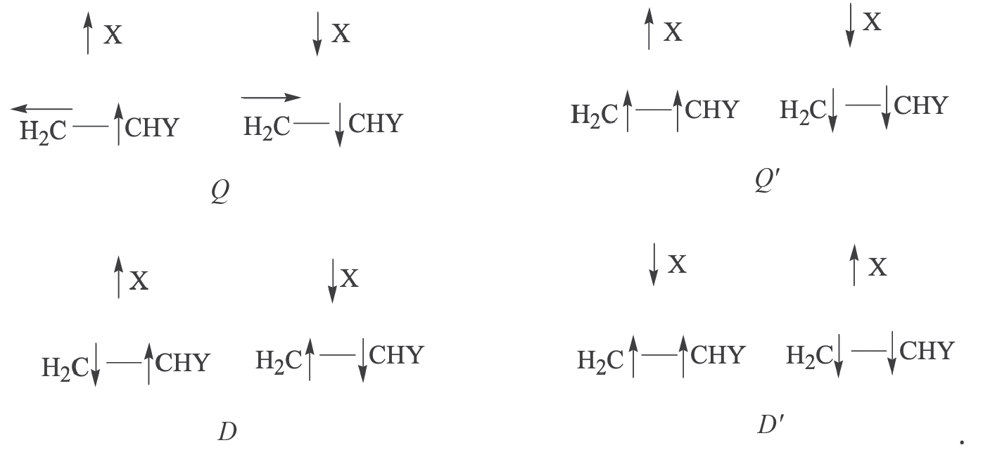 Можно предположить, что в дублетных состояниях1A·D0 торсионное вращение метиленовой группы в комплексах C2H4-CCl3 и s-транс-С4H6-CCl3 обеспечивает распаривание электронов π-связи этилена и s-транс-бутадиена-1,3. В результате происходит трансформация дублетных состояний D (1A·D0) комплексов C2H4-CCl3 и s-транс-С4H6-CCl3 в квартетные состояния Q и Q′, которые можно представить схемой приняв, что знак полного спина системы совпадает со знаком его проекции: