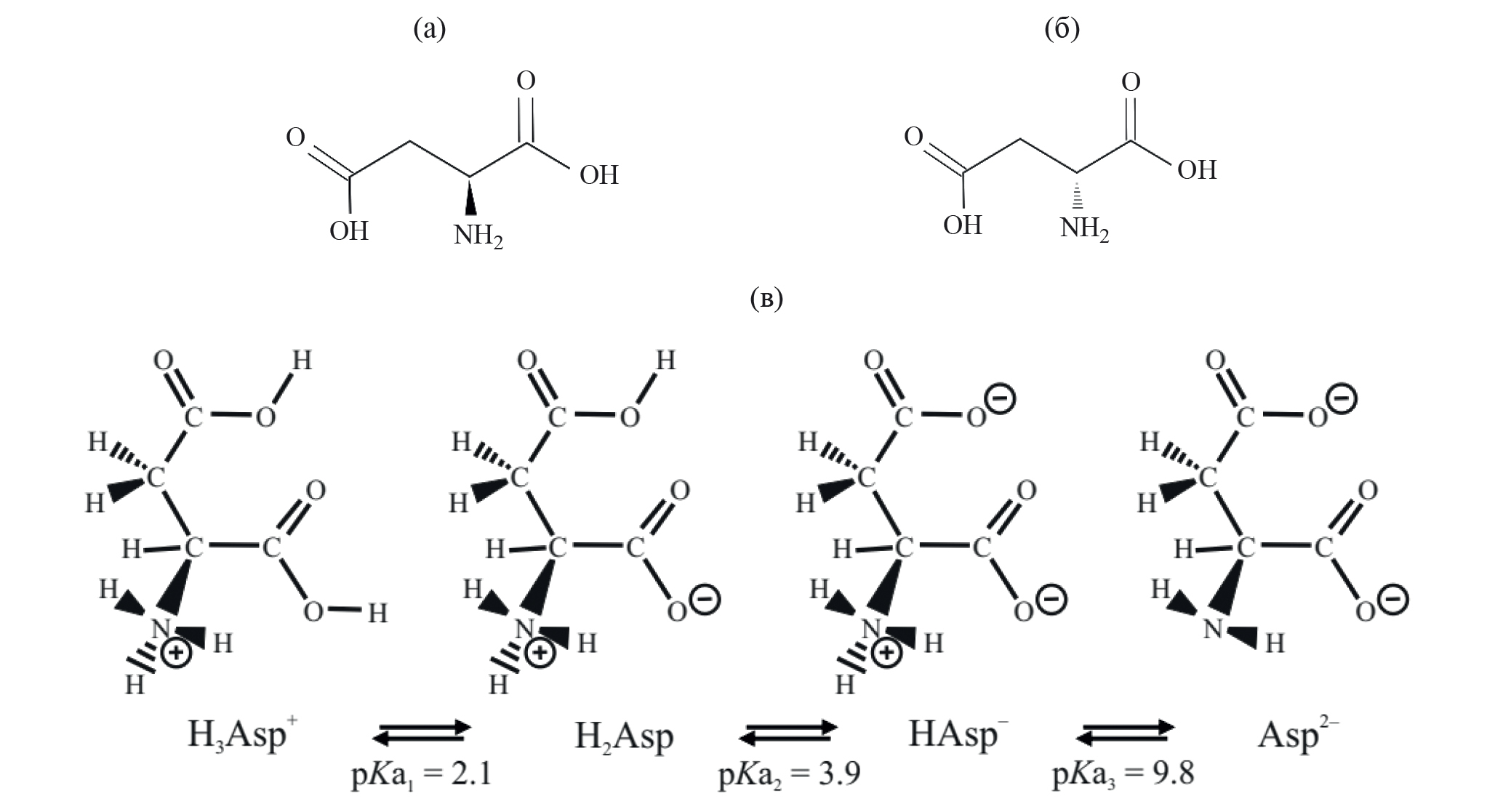 Рис. 1. Структурные формулы энантиомеров L-AspA (а), D-AspA (б) и структуры ионов AspA при разном значении рН (в).