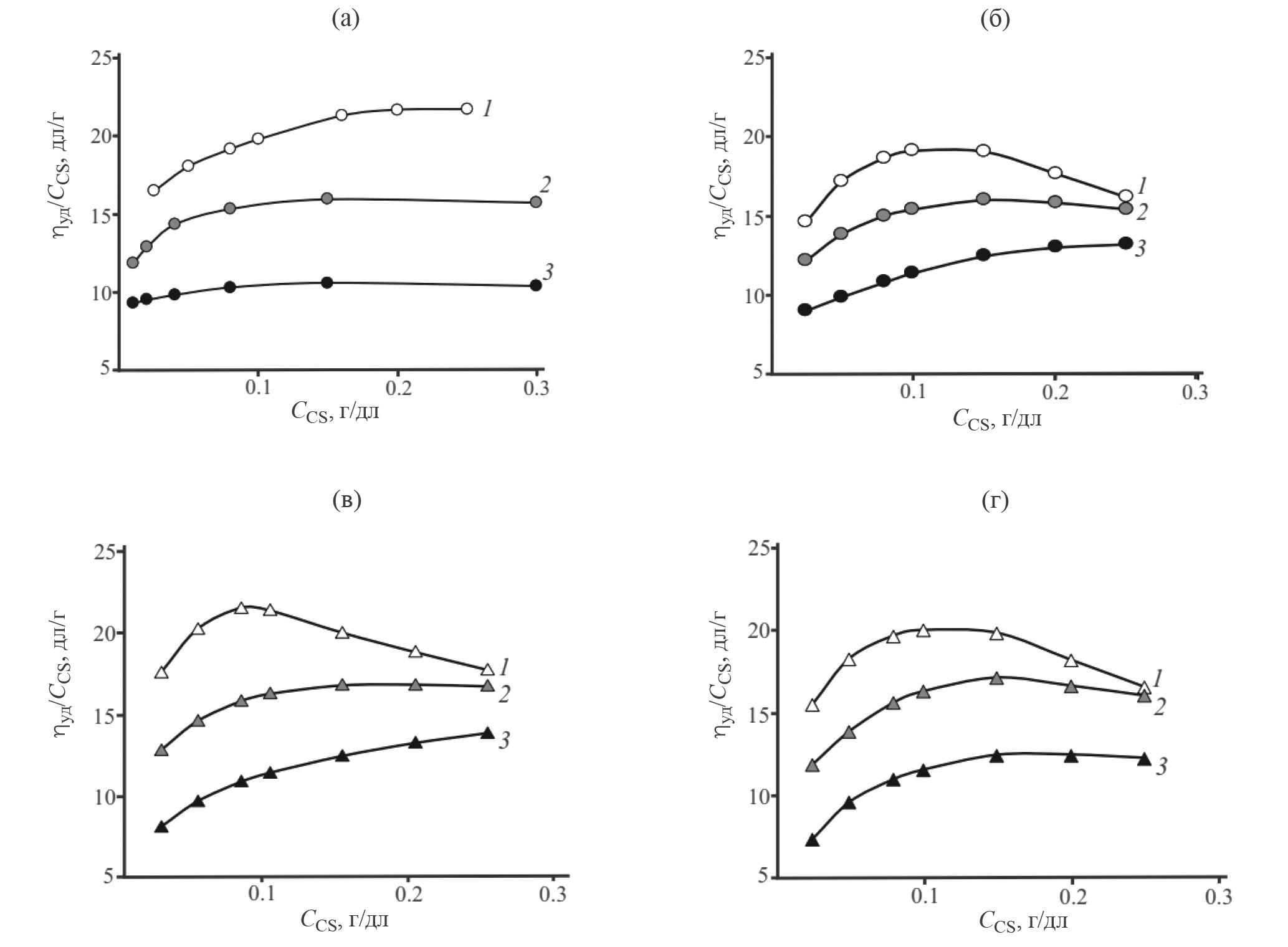 Изучение гидродинамических свойств показало, что CS∙L-AspA и CS∙D-AspA в водной среде проявляет свойства полиэлектролита с частично скомпенсированным зарядом. Концентрационная зависимость ηуд/СCS отличается от классических полиэлектролитных систем, число вязкости которых возрастает с понижением концентрации полимера за счет отталкивания одноименно заряженных звеньев вследствие их пространственной удаленности от свободных противоионов. Функция ηуд/СCS = f (СCS) растворов CS∙L-AspA и CS∙D-AspA имеет плато и ниспадающую ветвь, либо небольшой максимум (рис. 3а, б). Это свидетельствует о смешанном полиэлектролитно-иономерном состоянии макроцепей, когда часть противоионов кислотного остатка ассоциирована с макрокатионом. При этом соотношение между свободными и связанными формами противоионов определяется балансом их трансляционной энтропии (энтропии независимого поступательного движения) и процессом образования ионных пар между ~-NH3+ и НAsp–.
