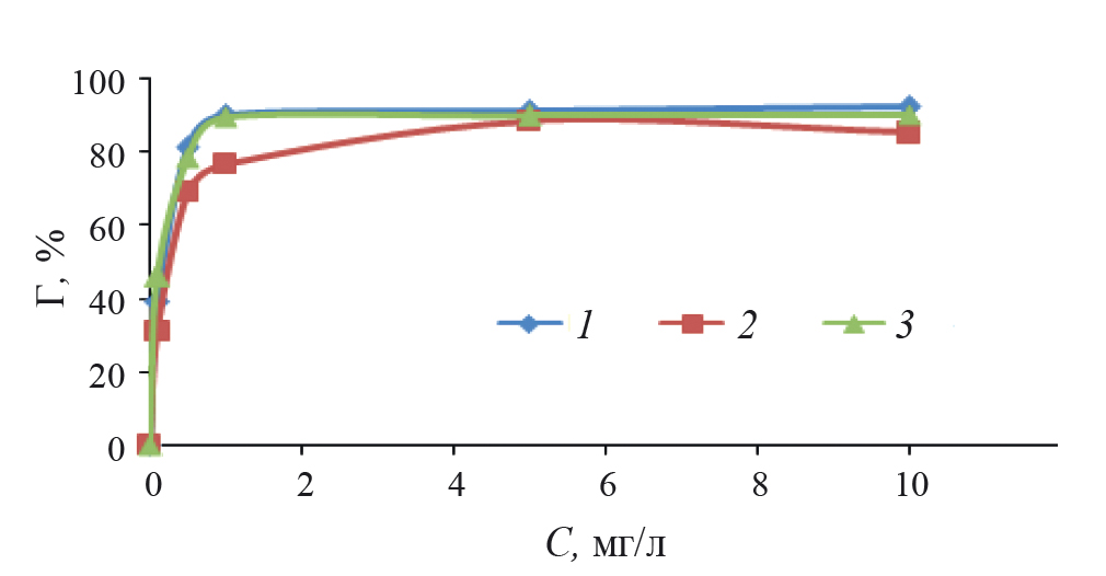 где Г – сорбционная способность, %; Сисх – исходная концентрация иона тяжелого металла, мг/мл; Ск – остаточная концентрация иона тяжелого металла, мг/мл.