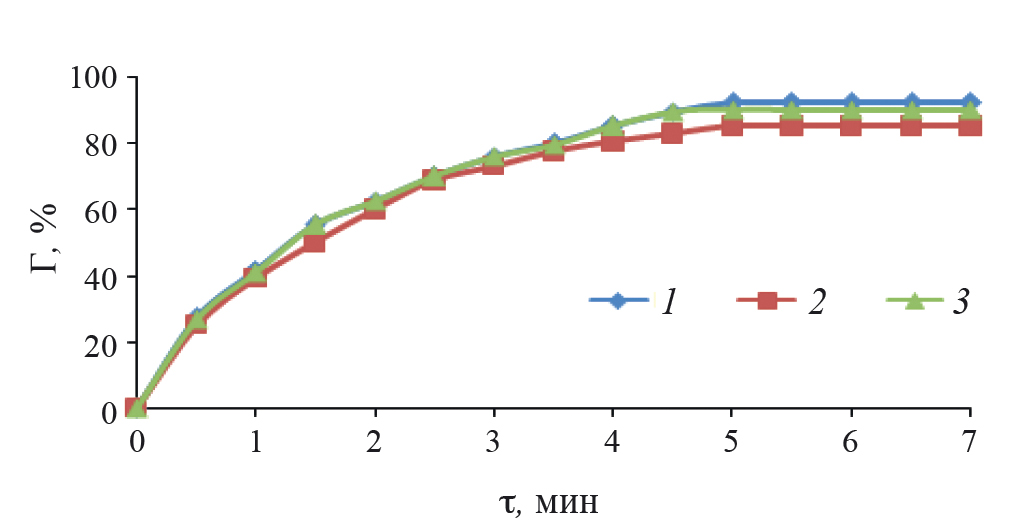 При изучении зависимости степени сорбции от времени сорбцию определяли с погрешностью ±0.01. По полученным данным построили кинетические кривые процесса сорбции ионов железа, меди и цинка глинистым материалом (рис. 2).