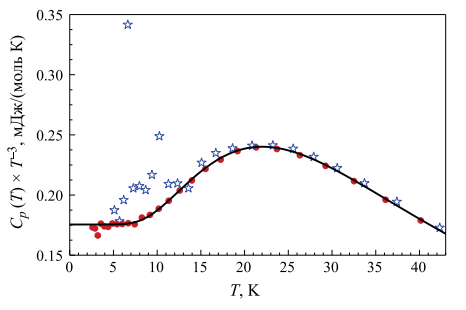 Из рис. 1 видно, что теплоемкость, деленная на куб температуры, выходит на “полочку”, что значит, что экспериментальные точки теплоемкости вблизи нуля (ниже 8 K) принадлежат области справедливости закона Дебая. Однако эта область характеризуется повышенным экспериментальным разбросом, что делает решение неустойчивым при варьировании начальной и конечной точек. Чтобы расширить экспериментальный интервал, на основе которого будет выполнена экстраполяция теплоемкости, была использована комбинация теплоемкостей модели Дебая CD(T, θD) и Эйнштейна CE(T, θE) [15, 16]: