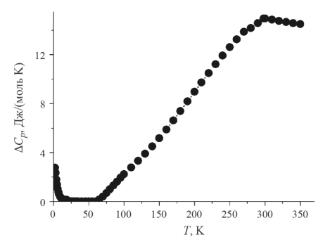Повышение теплоемкости твердого раствора Yb2O3‧2HfO2 относительно Lu2O3‧2HfO2 за счет вклада аномалии Шоттки [22] наблюдается при температурах выше ~70 K (рис. 4) и достигает максимума ~15 Дж/(моль K) около 300 K. Определение разности при более высоких температурах не имеет смысла из-за погрешностей в измерениях теплоемкости методом ДСК.