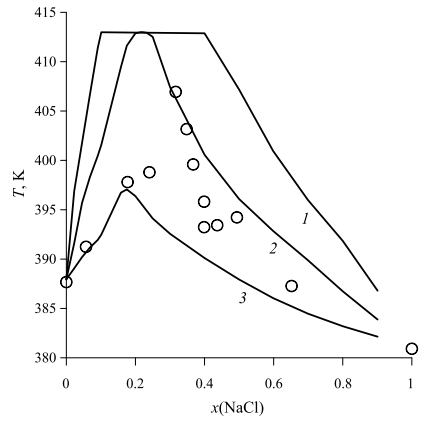 Рис. 8. Температуры кипения насыщенных водных растворов в системе H2O – NaCl – KNO3 при атмосферном давлении. По оси абсцисс отложена мольная доля соли NaCl (x), рассчитанная как отношение количества молей данной соли к общему количеству солей в системе. Символы – экспериментальные данные [9], линии – рассчитано в наст. работе (валовые моляльности солей в образцах № 2, 3 меньше, чем в № 1 примерно в 2.3 и 7.2 раза соответственно).