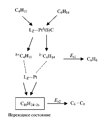 Катализаторы на основе благородных металлов также активно исследуются в ароматизации бутана. В работе [25] было показано, что превращение алканов С3–С4 при переработке совместно с бензиновыми фракциями в ароматические углеводороды реализуется на алюмоплатиновых катализаторах, содержащих предельно дисперсную Pt в заряженной форме. В результате исследований был установлен новый класс реакций, протекающих на алюмоплатиновых катализаторах, вероятно с участием бинарных центров, в мягких условиях совместной ароматизации легких углеводородных газов и С6-алканов с образованием С6+-продуктов, включая ароматические УВ (рис. 2).