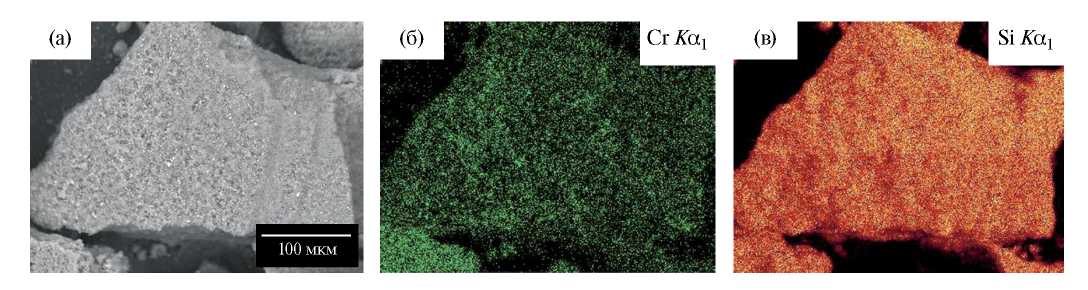 Рис. 2. Электронная микрофотография (а), карты по элементам для образца 5Cr/SiO2_CTMABr (б, в).