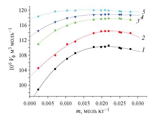 Рис. 2. Концентрационные зависимости кажущихся молярных объемов (Vϕ) никотиновой кислоты в водном буферном растворе L-гистидина при температурах: 288.15 (1), 298.15 (2), 303.15 (3), 308.15 (4), 313.15 K (5); mHis=0.0125±0.002 моль⋅кг–1.
