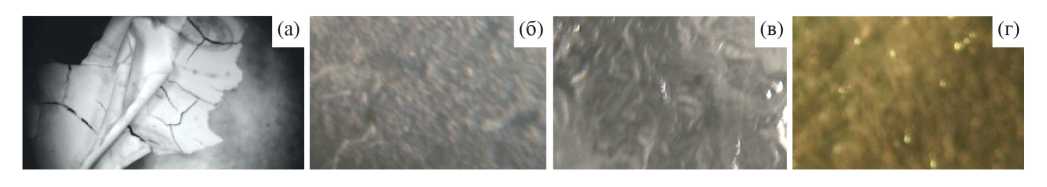 Рис. 1. Вид рельефов поверхностей материалов межфазных образований, перенесенных на стеклянные подложки, полученных в системе 0.1 М водный раствор YbCl3–0.1 М раствор кислоты в гептане; Д2ЭГФК (а), стеариновая (б), миристиновая (в), олеиновая (г). Увеличение – 42.7.