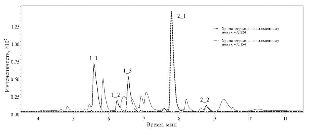 На рис. 1 представлена хроматограмма водного раствора продуктов трансформации НДМГ с выделенными ионами с m/z 154 (пики 1_1, 1_2, 1_3) и m/z 224 (пики 2_1 и 2_2).