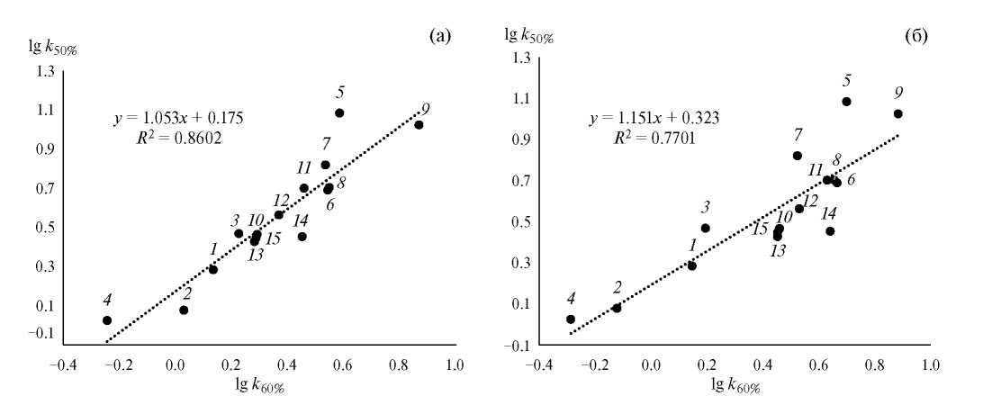 Рис. 3. Корреляции (а, б) между факторами удерживания исследованных соединений при различных составах элюента.