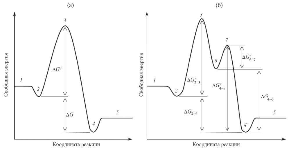 Рис. 1. Энергетический профиль поверхности потенциальной энергии вдоль координаты реакции для одно- (а) и двухстадийной (б) реакции.