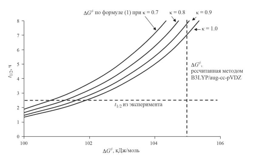 При трансмиссионных коэффициентах κ от 0.7 до 1 значения ΔG≠ попадают в диапазон 101–102 кДж/моль (рис. 2). Тогда разница со значением, рассчитанным методом B3LYP/aug-cc-pVDZ составляет всего 3–4 кДж/моль, что считается желаемой расчетной точностью для величин размерности энергии [26].