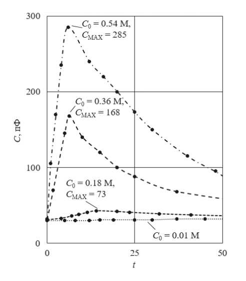 В результате экспериментального исследования методом диэлектрометрии системы бутаноилхлорид–н-бутанол при T = 20°C были получены кинетические кривые с четко выраженным максимумом (рис. 5) [21]. Значение максимума емкости CMAX сильно возрастает при увеличении концентрации реагентов с 73 пФ при концентрации 0.18 М до 285 пФ при концентрации 0.54 М (рис. 5).