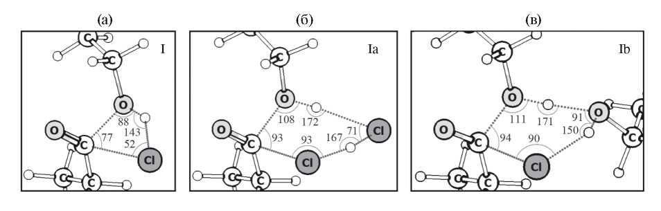 В гомогенной среде эффективность каталитического процесса связана с изменением энергии молекулярной системы, вызываемой третьей молекулой. Если третий участник образует водородные связи ОН⋅⋅⋅Сl и ОН⋅⋅⋅О, то валентные углы выгодно изменяются в переходном состоянии (рис. 6). Это способствует переносу протона и реализации каталитического процесса. Образование тримолекулярных водородно-связанных комплексов приводит к снижению ΔG≠ [11, 12]. Рассчитанные значения ΔG≠ для элементарных би- и тримолекулярных реакций алкоголиза алифатических ацилхлоридов относятся к диапазону эффективных процессов (рис. 3, табл. 1). Таким образом, эффективное управление реакцией непосредственно связано с использованием взаимодействия посредством водородной связи для ускорения определенных процессов при температуре окружающей среды.