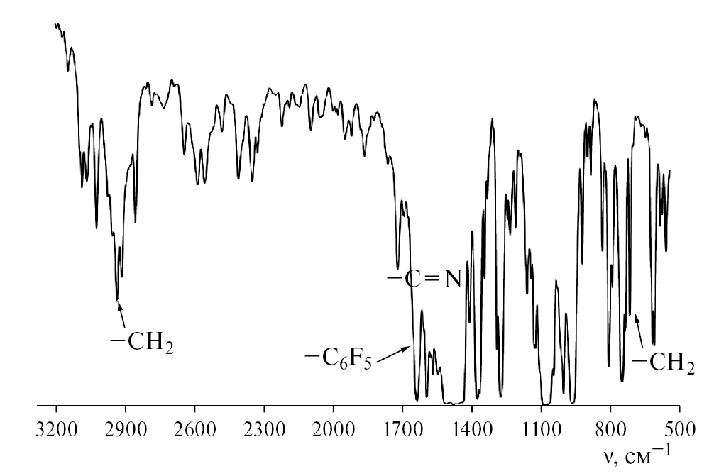На рис. 1 представлен ИК-спектр полученного соединения. Из рис. 1 видно, что на ИК-спектре отсутствуют полосы поглощения групп –С6F4 (946 см⁻¹), и полосы поглощения связи Ge–H при 790 и 2220 см⁻¹, наличие полосы поглощения группы –С6F5 (1650 см⁻¹), деформационных колебаний групп –CH₂– (520 см⁻¹) и валентных колебаний (2935 см⁻¹), групп –C=N пиридинового кольца (1600 см⁻¹) свидетельствует в пользу образования нового соединения – трис(пентафторфенил)-2-пиридилэтилгермана.