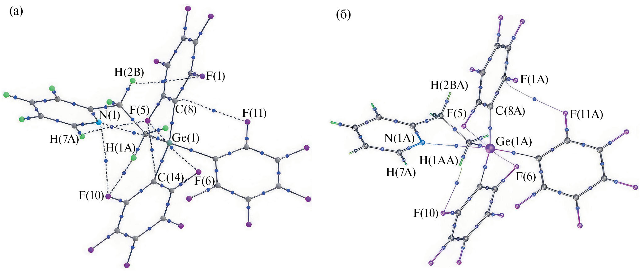 Углы C–Ge–C лежат в диапазоне значений 100.36(14) – 121.68(15)° в молекуле А и 98.89(14) – 122.58(15)° в молекуле В (табл. 2). Указанный интервал значительно шире по сравнению со значениями, наблюдаемыми в родственном трис(пентафторфенил)-4-пиридилэтилгерманиевом комплексе (105.29(7) – 116.11(7)°) [13]. Кроме того, наблюдается определенное различие во взаимном расположении пентафторфенильных лигандов в Iа и 4-пиридилпроизводном опубликованном ранее. Так, наименьший двугранный угол между плоскостями C6F5-лигандов составляет 45.3 и 45.9° в молекулах А и В комплекса Iа. Тогда как в литературном комплексе германия минимальный угол между указанными лигандами составляет не менее 55.3° [13]. Вероятно, причиной таких различий в молекулярном строении является реализация взаимодействия между атомом азота 2-пиридилэтильного лиганда и атомом германия в комплексе Iа. Расстояния Ge(1)-N(1) составляют 2.705(4) и 2.695(4) Å в молекулах А и В соответственно. Эти значения существенно превышают сумму ковалентных радиусов атомов германия и азота (1.91 Å) [38], однако значительно меньше суммы ван-дер-ваальсовых радиусов этих элементов (3.70 Å) [39]. Пятикоординационные комплексы германия встречаются гораздо реже, по сравнению с четырехкоординационными (892 vs 4922 примеров в кембриджском банке структурных данных (ConQuest 2022.3.0) [40]). Для того, чтобы зафиксировать наличие внутримолекулярного Ge–N взаимодействия и количественно оценить его энергию мы предприняли попытку перекристаллизовать кристаллы комплекса Iа из ТГФ с целью получения сильно отражающих кристаллов для проведения высокоуглового рентгенодифракционного эксперимента. В результате получить кристаллы, пригодные для проведения прецизионного рентгеноструктурного анализа, нам не удалось. Интересно, что вместо кристаллов пластинчатой формы были получены бесцветные палочки. Оказалось, что вновь полученные кристаллы представляют собой моноклинную полиморфную модификацию Iб. Как и в случае триклинной модификации Iа асимметричная часть элементарной ячейки содержит две независимые молекулы (A и B), имеющие минимальные отличия в строении (RMSD = 0.118 Å). Все основные геометрические характеристики в молекулах двух полиморфных модификаций близки друг к другу (табл. 2).