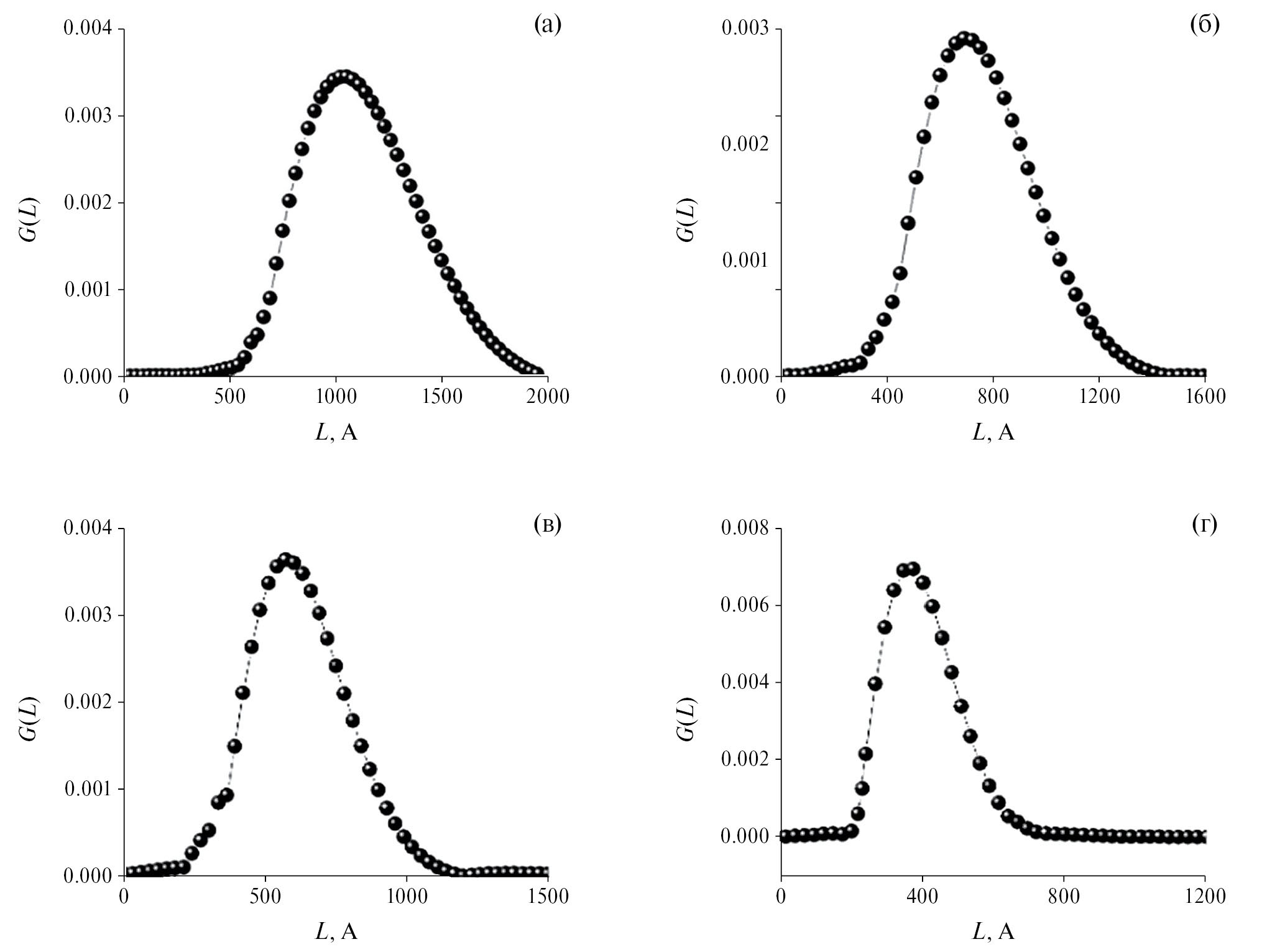 Из сопоставления измеренных наборов интенсивностей для образца и эталона с помощью функции псевдо-Фойгта был извлечен соответствующий правильный профиль линии с введенной поправкой на инструментальное уширение. Функции распределения по размерам G(L) были восстановлены из правильного профиля, следуя процедуре, предложенной в [19–21] и подробно описанной в [23, 24].